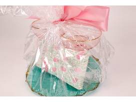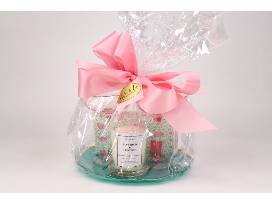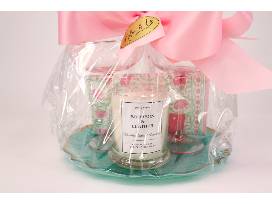 This charming gift basket from Ada and Lo, a local gift shop in Lexington, contains a bourbon & leather scented candle from Kentucky Green Studio, two pink coupe glasses, and Twos Company floral guest napkins (20 count), all arranged on a beautiful teal serving plate with gold trim!