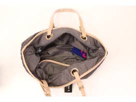Fashion meets function with this quilted faux leather tote from Satchels New York. The soft, quilted, slate grey micro check fabric is accented with faux vegetable leather accents. Gold-plated grommets and buckles give this bag that extra touch. Completely lined and features a large open inside pocket on one side and a zippered pocket on the other side with a cell phone pocket. Faux leather zipper pull tabs and a key ring to keep your keys out of the way.
