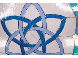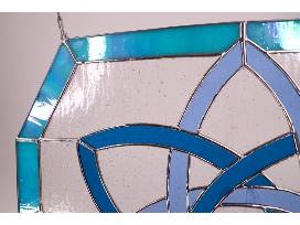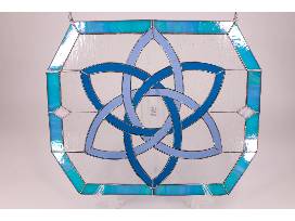 Local artist and CASA Volunteer Manager Sarah Fightmaster is the talent behind this gorgeous stained glass piece! Created in her shop Gypsy Wings, Sarah has designed and handcrafted this 17.5 in. x 14.5 in. stained glass panel with a clear, sky blue, and white double triquetra design. This piece will certainly bring light and color into your home!