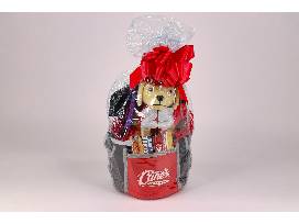 Love Raising Cane's Chicken Fingers? Get your fingers on this gift basket! Includes a 2022 Limited Edition 25th Birthday Plush Puppy, a coupon card for one free 22 oz. lemonade, a coupon card for one free box combo, a "One Love" purple and yellow Cane's koozie, a black Cane's hat, "Lip Sauce" unscented lip balm, a Cane's magnet, and branded paw-print post-it notes, all in a Raising Cane's cooler bag!
