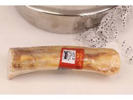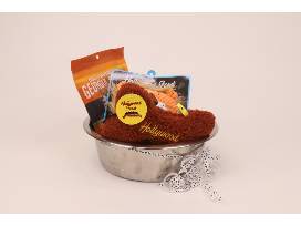 Show your dog how much you love them with this gift basket! This gift basket is created with your dog in mind, starting with the large stainless steel dog bowl that holds the rest of the items. You will find a red fleece bone-shaped squeaky toy inside the bowl, a Nubbie Buddies round lion squeaky toy, and a 6 in. - 7 in. center cut beef bone, and a 10 oz. bag of Georgia Smoked duck and sweet potato sausage links. Your dog will be barking for joy at this basket!