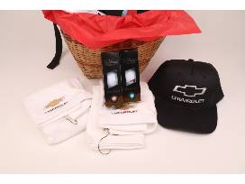 Get a Dan Cummins Deal with this gift basket! Included in the basket are a black Chevrolet backpack, six Titleist golf balls, black Dan Cummins sunglasses, a size medium white Dan Cummins Callaway polo, a black Chevrolet baseball cap, two white Chevrolet towels, and a black Chevrolet umbrella.