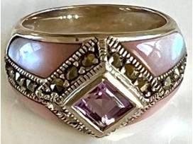Looking for the perfect accent set to complete your look? This gorgeous size 7 sterling silver Judith Ripka ring with matching 2" Goat pin/enhancer will add a pop of pink to any outfit. This set features gorgeous pink mother of pearl. You don't want to miss this one!