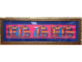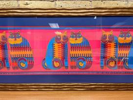 This beautiful 62" x 19.5" piece of artwork is actually a framed silk scarf with bright colors and cats! Add this conversation starter to your home.