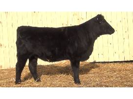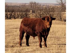 Here's a long bodied, well built Gizmo daughter out of an excellent Clark cow whose dam goes back to Lisbon. She's carrying the red gene and is safe in calf to our National Champion fullblood EZ Hollywood 29H. She'll make a nice 1100# cow! She's extremely capable of raising a nice show calf, especially bred to Hollywood!