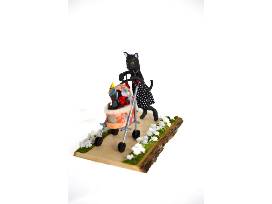 Boozle's Buddies Pet Vignettes by Jill Murphy. Polymer clay/mixed media primitive sculpture of Mother cat with 3 kittens in a stroller.