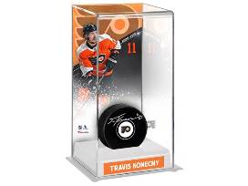 - One (1) Travis Konecny Philadelphia Flyers autographed hockey puck with deluxe tall hockey puck case