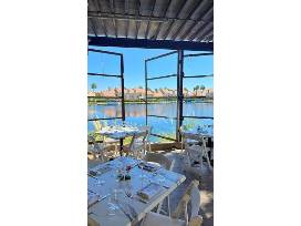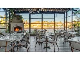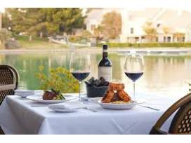 Guests can enjoy their meals on a serene patio overlooking a lake, with views of swans and other wildlife, or in a beautifully decorated dining room with wine cork art and chandeliers.