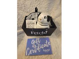 A doggie themed gift basket with dog cookie jar, pot holder and wooden quote block. Included is a $50 gift certificate for Fetch! Pet Care services (dog walking, pet sitting, overnight care, etc).