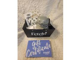 A Cat themed gift basket with a kitty cookie jar and kitty decorative hanging sign. Included is a $50 gift certificate for Fetch! Pet Care services (dog walking, pet sitting, overnight care, etc).