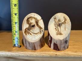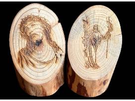 These stunning wooden pieces of decor show Jesus before his crucifixion, and after his resurrection. They are made of pine trees that have died from Beetle damage. These trees are often streaked with hues of blue and gray that contrast with the natural yellow, white, and beige colors. They are a symbol of Christ's victory over death. Bring Christ into your home with these beautiful pieces!