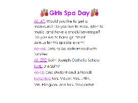 Event will take place at Saint Joseph School from 3:00-4:15 p.m. The date will be coordinated with the winners. It's going to be a fun and special Girls Spa Day Event!