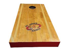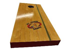 0This is not your ordinary cornhole game! What's unique about this game, is that it is made from maple flooring originally from the Mayer Lutheran High School gymnasium. The finished game even shows part of the basketball foul lines! To make it even better, the Saint Joseph Saints logo is applied to the top!