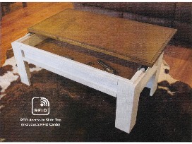 Features a concealed compartment with secured radio frequency identification (RFID) sliding top access. Distressed white base, made of solid wood and wood veneer with walnut finish sliding table top, also includes a felt-lined compartment, easily accessed with two RFID cards.