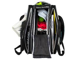 The Vulcan VTEAM Backpack takes the function of the VPRO Backpack to another level, as the ultimate tournament backpack. This wide-body style backpack features a dual zipper, extra-large center pocket for easy access. There is plenty of storage space for extra clothes, towels, and paddles. The two large side insulated compartments for up to 6 paddles or keeps drinks and snacks cool, two smaller storage compartments for accessories, an inside zippered pockets for valuables, and a ventilated shoe compartment. An easy access top zippered compartment for cell phones, wallet, and keys. The dual fence hanger hooks allow you to keep your bag off the ground. 12" wide x 23" tall x 11" deep.