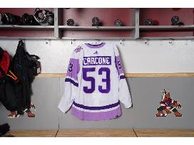This jersey was issued for the Coyotes vs. Avalanche game on November 30th, 2023 and autographed by #53 Michael Carcone.