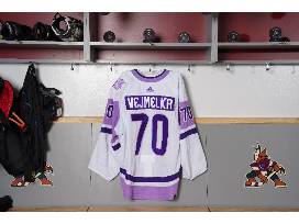 This jersey was issued for the Coyotes vs. Avalanche game on November 30th, 2023 and autographed by #70 Karel Vejmelka.
