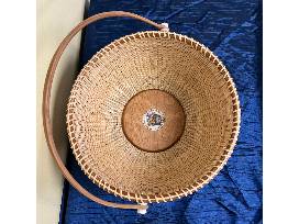 Hand-woven Nantucket Lightship Basket with cherry base, handle and rim. This basket features a 2" scrimshawed ivory inlay.