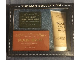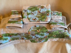 This set of 6 has 2 washcloths, 2 hand towels, and 2 bath towels. Each piece features a duck motif on gray towels. These were made by Earnestine Bergman. Also included is a 3 pc set "The Man Collection " from San Francisco Soap Co. The manly soap was donated by Jennifer Nichols.