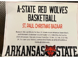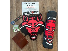 4 Arkansas State Basketball Tickets for Men & Women's Doubleheader Games on Saturday during 2023-2024 season. Also includes a Redwolf door hanger, blanket, bottle opener, journal & ceramic replica of Centennial Bank Stadium.