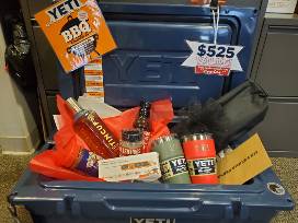 Yeti Grill & Chill - Yeti cooler filled with all your bbq essentials - Barbeque tool set, spices & sauce; thermometer, two yeti cups; Tincup Colorado Whiskey, chair