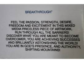 Breakthrough: Feel the passion, strength, desire, freedom and excitement in this mixed media priceless piece of artwork. Run through all the barriers! Discover what you are meant to become. Overcomer you are achieving successes and brilliantly astonishing the world. You are in God's presence, and authority, shifting mountains.