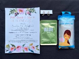Alongside brunch, enjoy some extra goodies such as an aloe soothing mask, a satin pillow case, and pearl golf hoop earrings.