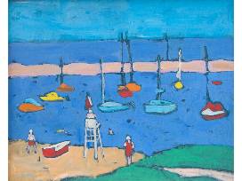 "The Guard Chair" is a limited edition giclee printed on handmade paper by renowned artist, Marion Coffey. The print measures approximately 18.5" x 15", framed to 26" x 22." Often inspired by natural beauty; Marion painted a series of Lake Michigan landscapes, this in particular captures the essence of summer in Wisconsin. This beautiful and rich painting showcases Coffey's enthusiastic use of color and carefree layering of shapes. Coffey's paintings and prints captivate many loyal collectors and admirers across the country. Do not miss the opportunity to own a Coffey or add another to your collection.