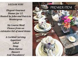 Six Course Meal: John and Patricia Westergren will provide an extensive list of items to choose from including pre-dinner cocktail hors d'oeuvres, appetizer, soup, salad, main meal and dessert. Chocolates and a liquor coffee drink will end your evening while you linger at the table! Table setting, food preparation and clean up included. Alcohol is not included. Mutually agreed upon dinner date.