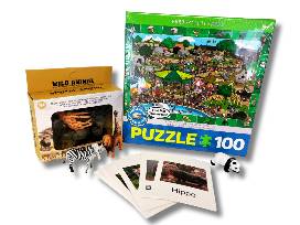 Enjoy a One Year Family Membership at the Toledo Zoo, a zoo puzzle, and zoo animal figurines with fact cards.