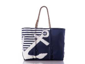 Three nautical favorites-an anchor, sailor stripes, and signal flag- are represented on this roomy tote made from recycled sailcloth. We use sails that have known the sea and have unique character. Handcrafted at our shop in Portland, this tote is made to be tough, so don't hesitate to fill it to the gunwales!