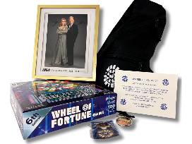 This package includes a signed + framed photo of Vanna White & Pat Sajak, a 6th Edition Wheel of Fortune Board game, WoF backpack, and accessories.