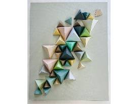 Each student in the Monarch classroom helped create this amazing cluster of tetrahedrons. This 24 x 30. neutral-painted canvas displays three different-sized, soothing-colored tetrahedrons. Each student cut and folded the four-sided triangles to create this amazing piece of art.