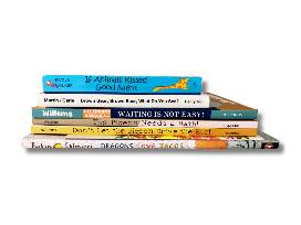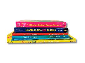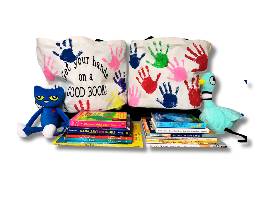Sassafrass classroom presents Mom & Me library totes already filled with some of your favorite children's books, a Pete the Cat, and Pigeon stuffed animals. These two "Get your hands on a good book" totes will brighten everyone's day with all the Sassafrass friend's handprints on them!