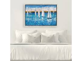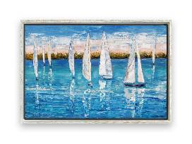 This is an original oil painting depicting a regatta race at sunset on a local bayou. This painting is painted exclusively with oil paint utilizing palette knives.
