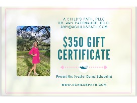 $350 gift certificate to A Child's Path. A Child's Path, PLLC provides school psychological and counseling services in the Tampa Bay community. Dr Amy Patenaude offers gifted testing, learning disability/dyslexia testing, ADHD testing, counseling services for children and parents and parent coaching. Services offered can be found at https://achildspath.com/about/. Use this voucher towards any service offered