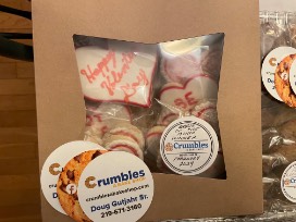 1 dozen Valentine's Cookies to take home with you from Celebration of gifts and a gift certificate that entitles you to 1 dozen cookies per month Delivery of monthly cookies to NWI only. March 1- Macadamia Nut White Chip, April 1-Short bread, May 1- Chocolate Chip, June 1- Peanut Butter Crisp Oatmeal, July 1- Chocolate Chip Pecan, August 1- Snowballs, Mexican Wedding Cakes, Italian Wedding Cakes, September 1- Cinnamon Raisin Oatmeal, October 1- Triple Chocolate Chip, November 1- Snickerdoodles, December 1- Gingerbread (Christmas bonus of Holiday Cookies), January 1- Peanut Butter Chocolate Chip. Donated by SMS parent, Doug Gutjahr, Crumbles-A Bake Shop