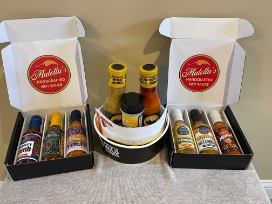 6 bottles of Maletta's Hot Sauce: Blueberry Bomb, Mexicali, Stinger, Pineapple Habanero, Mango, and Mommy! Extreme Hot Sauce.