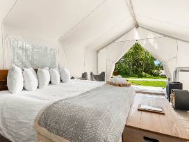 Only 35 minutes from Acadia, up to 4 guests (2 adults and 2 children) will enjoy three nights in one Deluxe glamping-style tent (king bed) and one adjacent kids' sleeping tent (2 twins) nestled between 100 acres of forest and sea. The airy accommodations boast West Elm furnishings, luxurious beds, and one bathroom with a warm shower, sink, and flushing toilet. Enjoy tasteful touches like organic bath products, luxe linens, and complimentary USB battery packs.