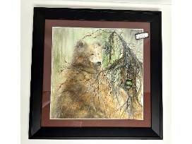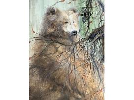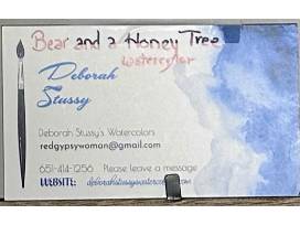 This is a 16" x 16" original watercolor painting of a Bear gazing at a Honey Tree with Bees and Honeycomb by Deborah Stussy. The intricate detail of the bear and its fur, along with the tree branches and dead leaves give a sense of realism to the htis work.