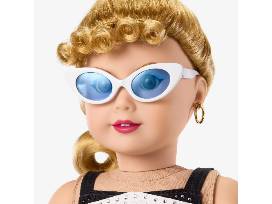 The doll also includes an authentic replica wrist tag, white cat-eye sunglasses with blue lenses, golden hoop earrings, and shiny black peep-toe shoes.