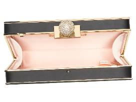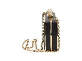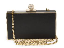 Black satin and a golden metal frame create a glamorous aesthetic on a sleek box clutch secured by a gleaming chain strap for effortless, hands-free carry.