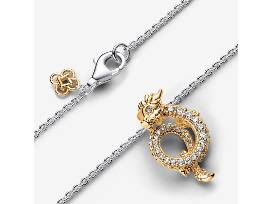 Invite good fortune in the coming year with the Two-tone Chinese Year of the Dragon Collier Necklace. 2024 is the Year of the Dragon - the 5th animal in the Chinese zodiac; this mythical creature represents good fortune, strength, power, wisdom, and health. This sterling silver necklace features a curled dragon pendant in 14k gold plating with intricate details and a row of sparkling pavé along the dragon's body. The pendant is not detachable and slides freely along the sterling silver chain, which is adjustable in length. A 14k gold-plated peace knot dangles near the clasp. Wear this necklace to invite the qualities of the dragon into your year ahead, or gift it to a loved one who was born in the Year of the Dragon.