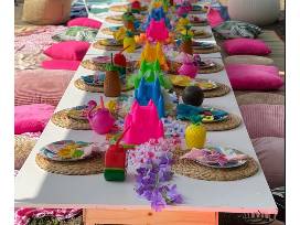 Sandi Z curated theme party for 12 kids including paper goods, tabletop decorations, and favors. Additional pieces can be purchased separately.