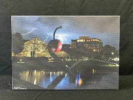 Illuminate your space with this exclusive 16x11.5in print featuring the iconic Spoonbridge and Cherry sculpture displayed at the Walker Art Museum. This incredible feat of photography captured a rare burst of lightning behind the iconic Twin Cities symbol, making this print a must-have for any proud local with a flare for the dramatic.