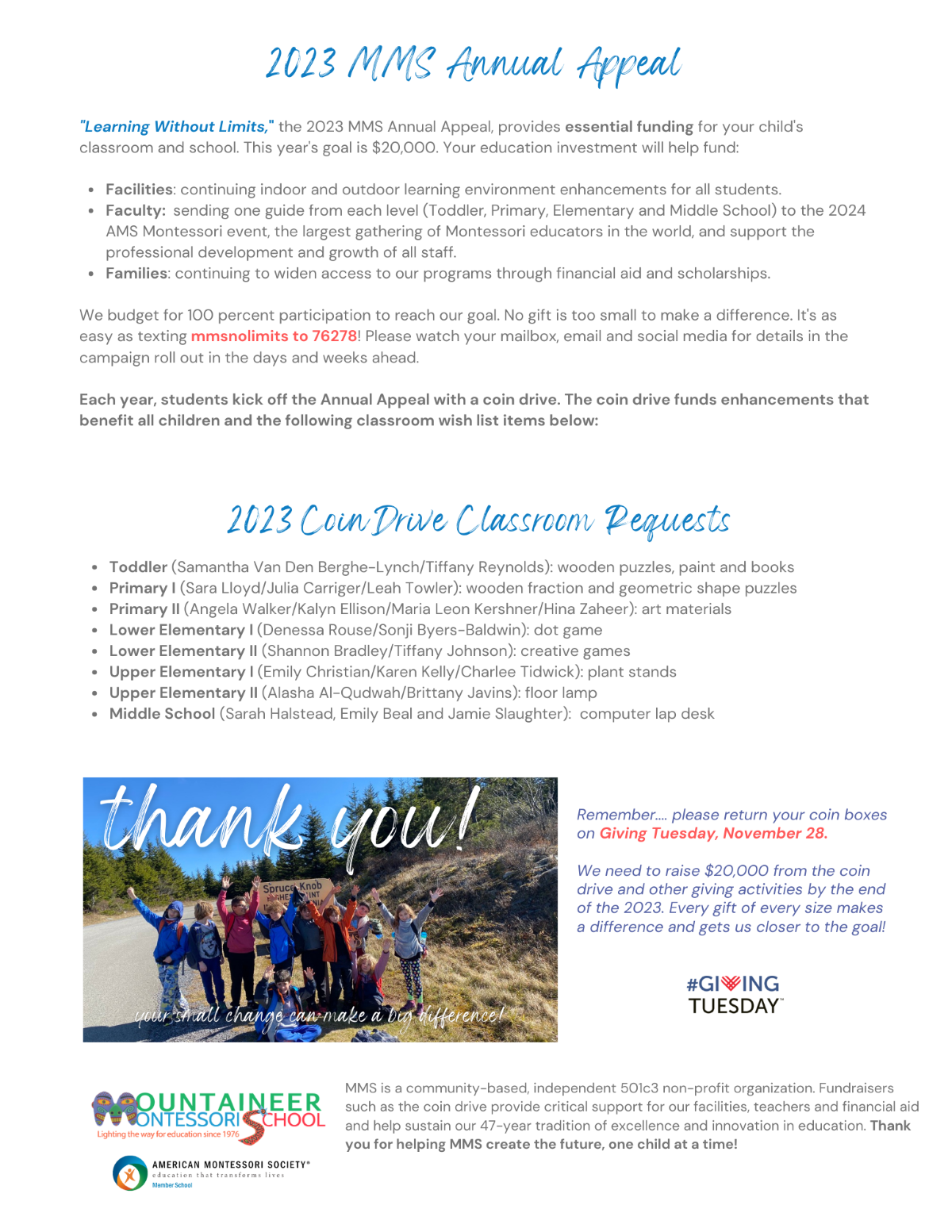 - Faculty: teacher appreciation and training funds and ongoing AMS accreditation initiatives, including sponsorship of one guide from each level (Toddler, Primary, Elementary and Middle School) to the 2024 AMS Montessori Event, the largest gathering of Montessori educators in the world.