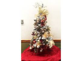 Gold and red ornaments adorn the beautiful white flocked tree. Topped with gold ribbon and draped around the tree with a red skirt hosting the Holy Family.