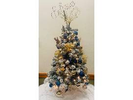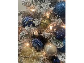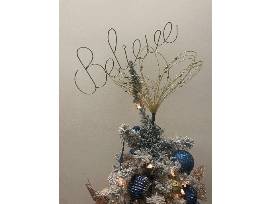 Gold and blue ornaments adorn the beautiful white flocked snow. Draped with gold ribbon and topped with Believe!